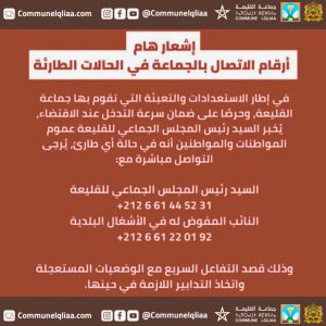 حرصًا على التواصل المباشر مع الساكنة وضمان سرعة الاستجابة، يخبر السيد رئيس المجلس الجماعي للقليعة عموم المواطنات والمواطنين أنه يمكن الاتصال في حالة الطوارئ عبر: