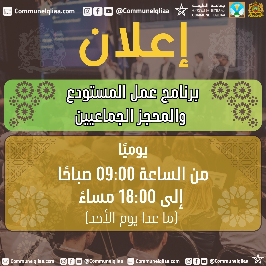 يتضمن الإعلان برنامج عمل المستودع والمحجز الجماعيين (Programme de travail du dépôt et de la fourrière communaux):