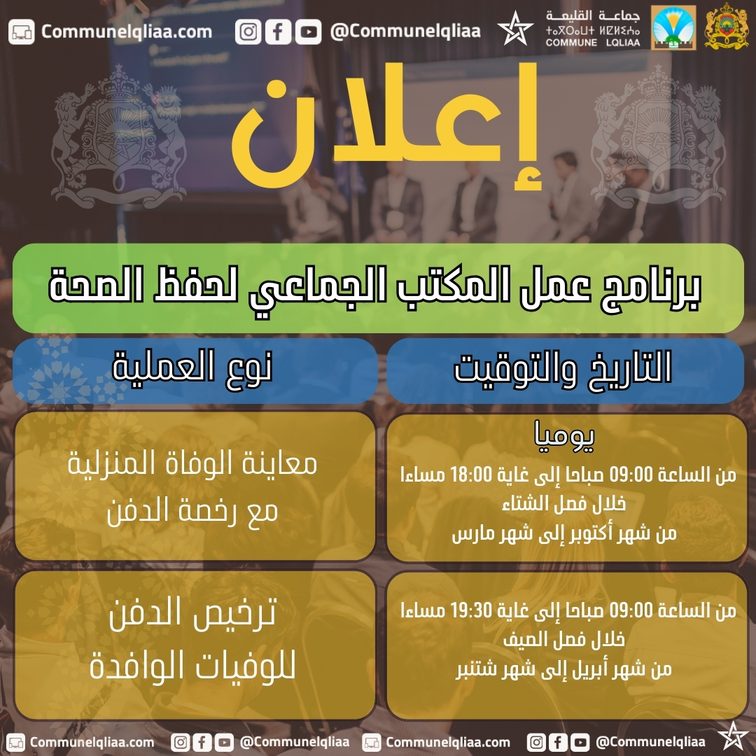 - معاينة الوفاة المنزلية مع رخصة الدفن : يوميًا من الساعة 09:00 صباحًا إلى غاية 18:00 مساءً خلال فصل الشتاء (من شهر أكتوبر إلى شهر مارس)
